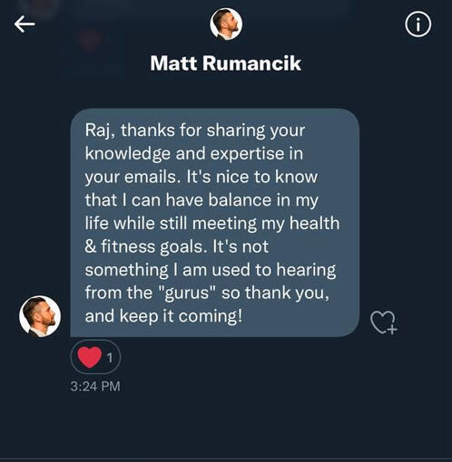 "Every time I see a Raj email arrive in my inbox, I instantly click to read.Just his content on Twitter has helped me grow 10lbs of muscle in 3 months – and his emails are even better. I highly recommend you join today for an actionable weight loss/muscle gain blueprint.You’ll have the exact steps to becoming a high-energy business owner."