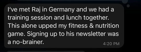 "I’ve known Coach Raj for the past 6 months and this guy knows his shit.I’ve been training for 10+ years and still learn from Raj whenever we hop on calls. He knows how to make your training and diet sustainable and shares all his secrets in his email newsletter.I’d join if I were you."